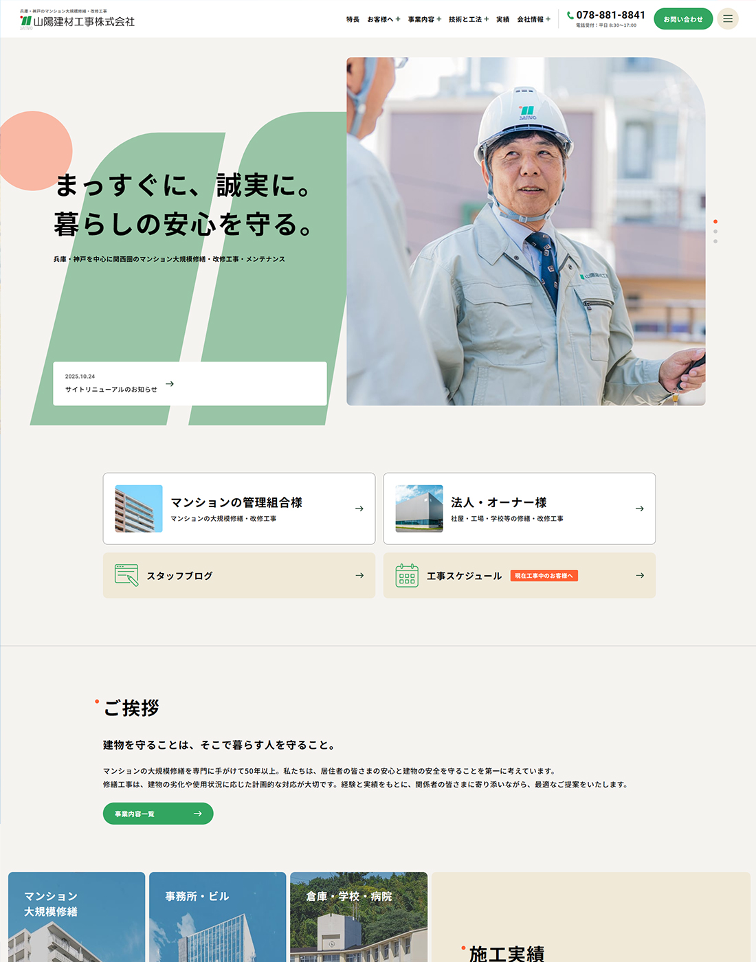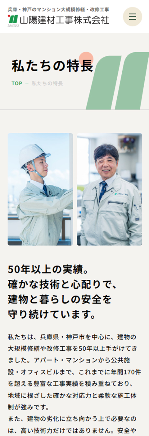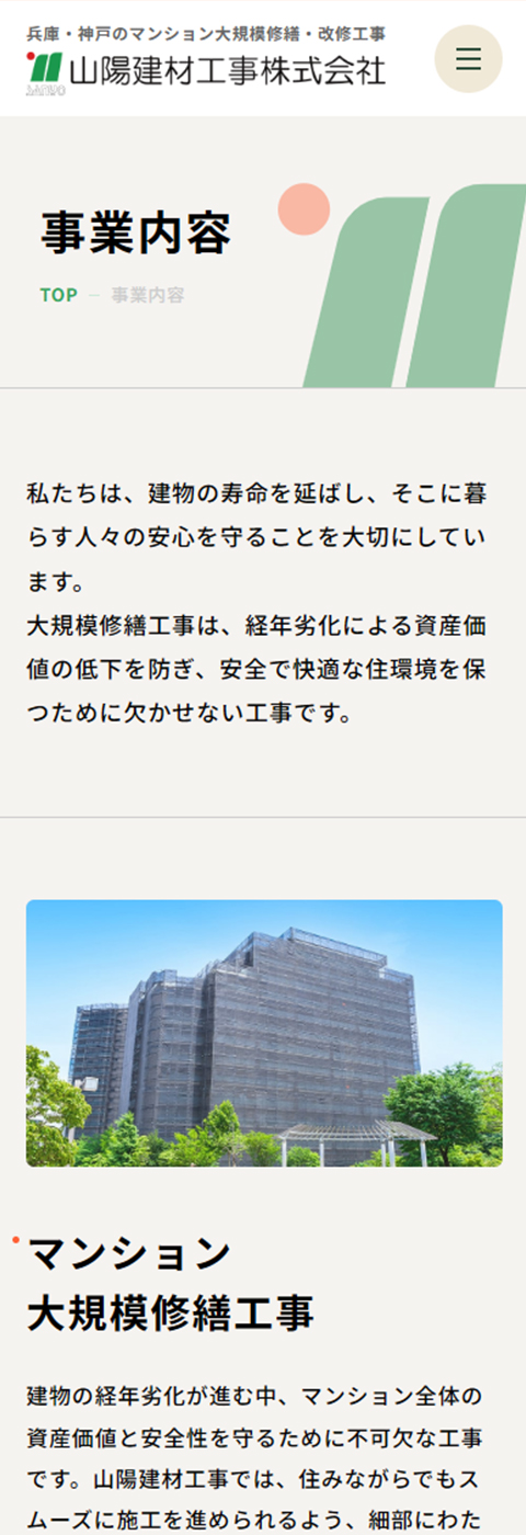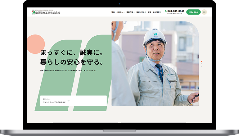 関西圏のマンション大規模修繕・改修工事・メンテナンスなどを行っている、山陽建材工事株式会社様のコーポレートサイトを制作しました。以前からサイトはお持ちでしたが、時代に合ったデザインと構成に刷新したいとのご要望から、今回リニューアルのご依頼をいただきました。マンション管理組合の理事長や修繕委員長などの方々に向けて、安心して相談しやすい企業であるという印象をあたえることを意識しました。