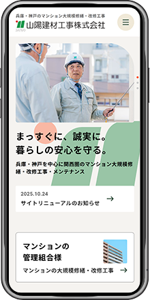 関西圏のマンション大規模修繕・改修工事・メンテナンスなどを行っている、山陽建材工事株式会社様のコーポレートサイトを制作しました。以前からサイトはお持ちでしたが、時代に合ったデザインと構成に刷新したいとのご要望から、今回リニューアルのご依頼をいただきました。マンション管理組合の理事長や修繕委員長などの方々に向けて、安心して相談しやすい企業であるという印象をあたえることを意識しました。
