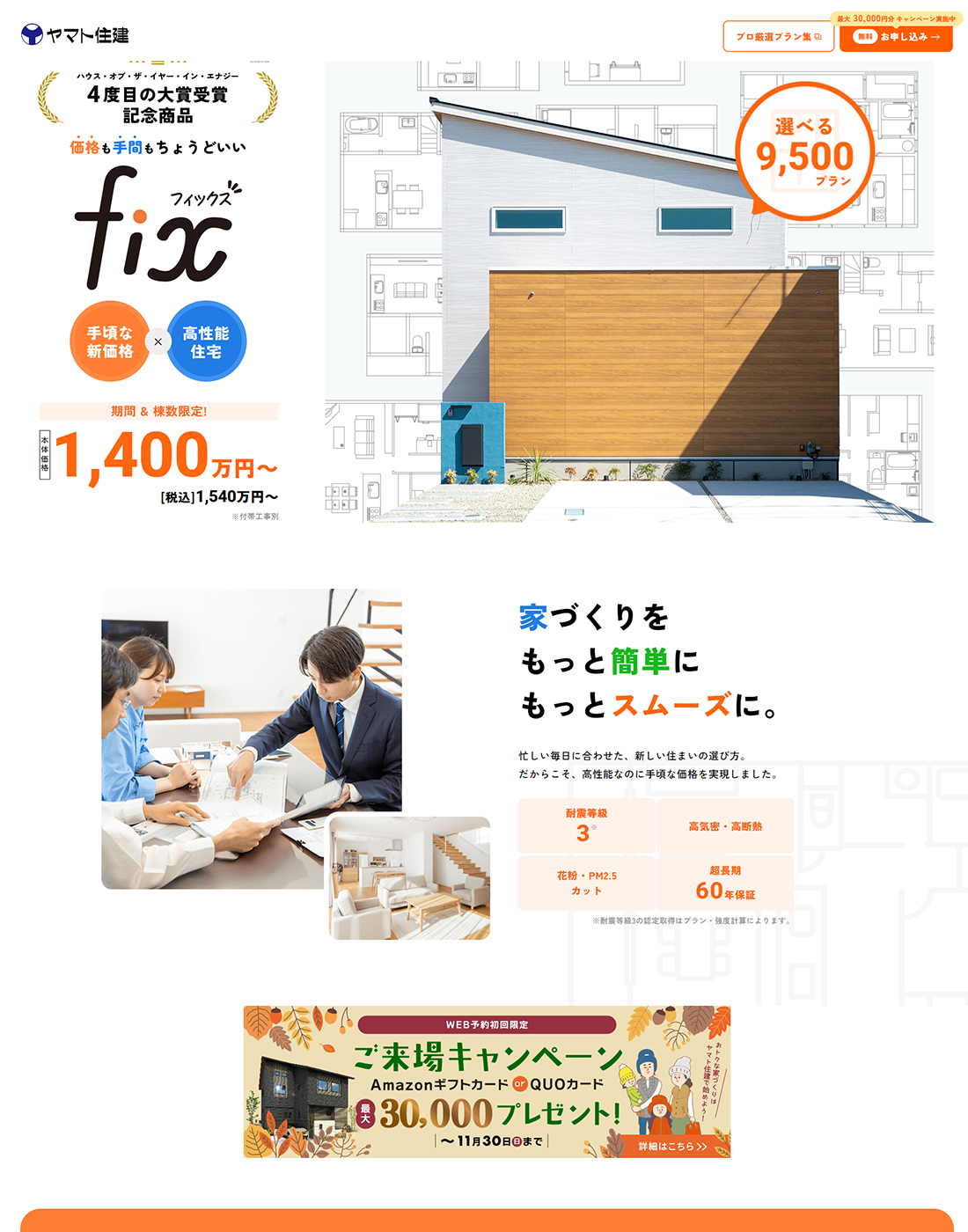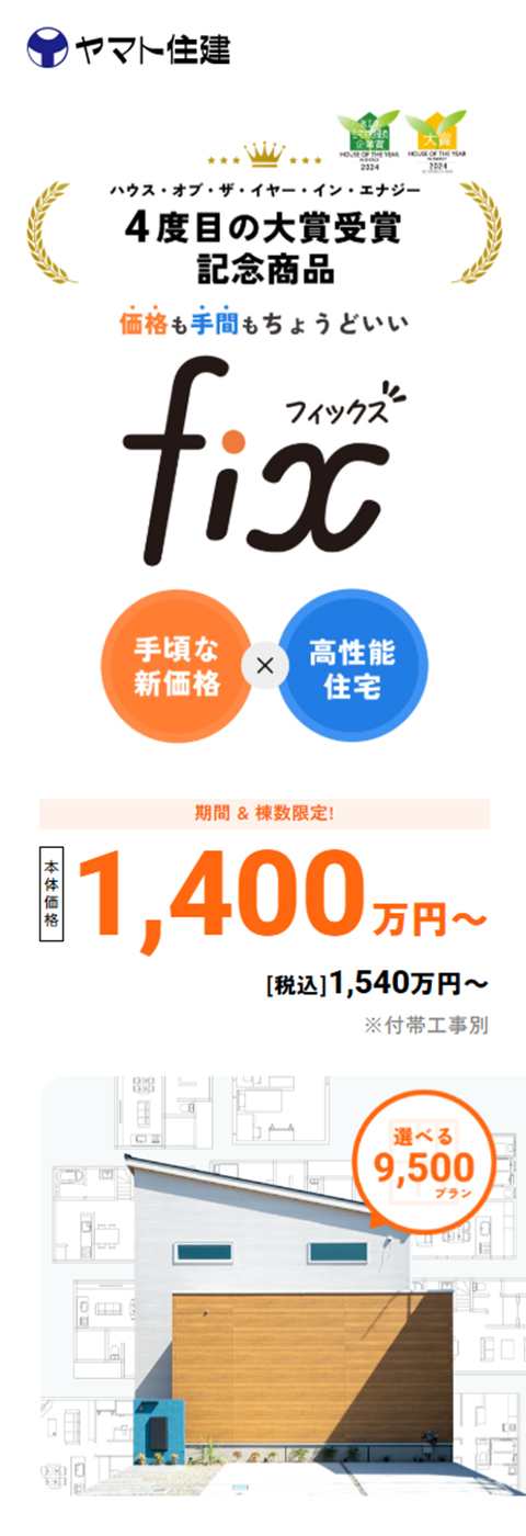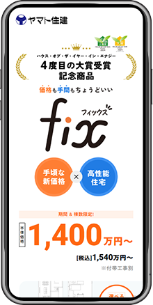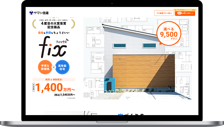 注文住宅や分譲住宅、不動産流通などの事業を営んでいる、ヤマト住建株式会社様の住宅サービスLPを制作しました。「FIX」のプロモーションを行いたいとのご要望から、今回制作をご依頼いただきました。住宅購入を検討しているユーザーに向けて、高品質な住宅に手が届く印象を与えるサイトを目指しました。