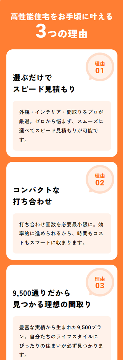 高品質な家がお手頃価格で手に入ることはもちろん、お客様に対して様々な選択肢を用意し、選ぶだけで簡単に家をづくりが叶うことを伝えるLPとしました。9,500通りから選べる間取りや、外観やインテリアなどの選択の自由さなども紹介。また、耐震性や保証制度などを丁寧に伝えることで、購入後の安心感醸成も大切にしました。