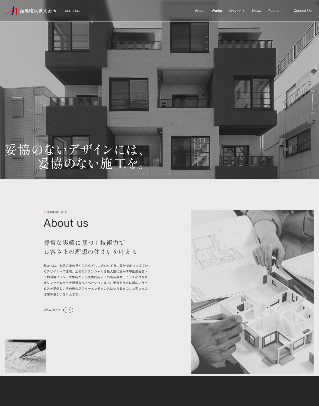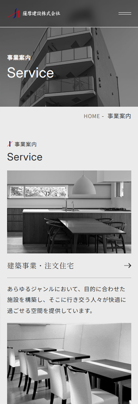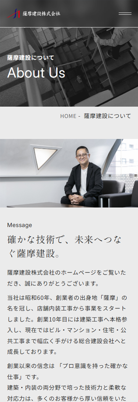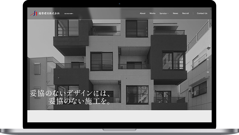 総合建築工事の設計・施工を行っている、薩摩建設株式会社様のコーポレートサイトをリニューアルしました。既存サイトが時代に合わなくなってきたとのお悩みから、リニューアルのお話をいただきました。今回のリニューアルではデザインを一新し、建物の魅力をより伝えられる構成へ変更することで、既存クライアントや求職者に向けて企業への信頼感や期待感を高めるサイトを目指しました。