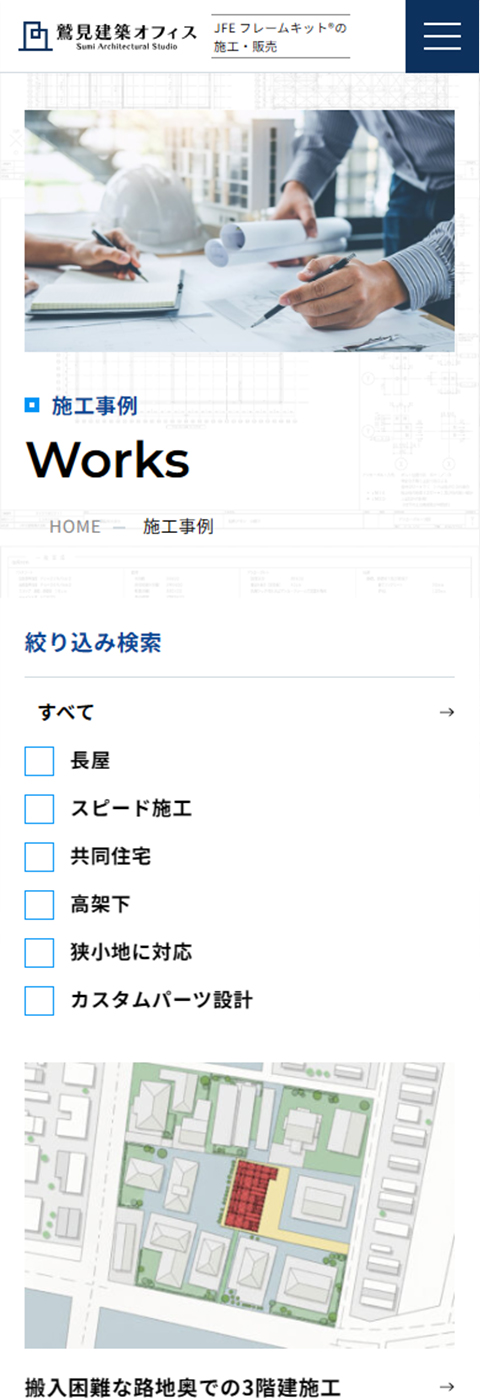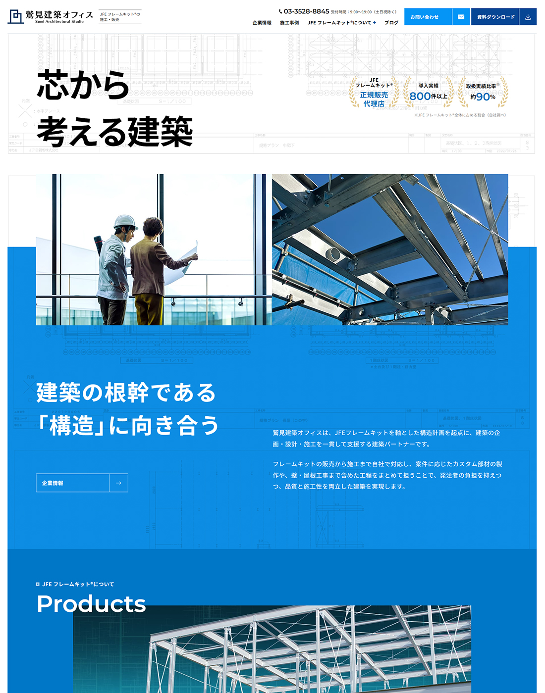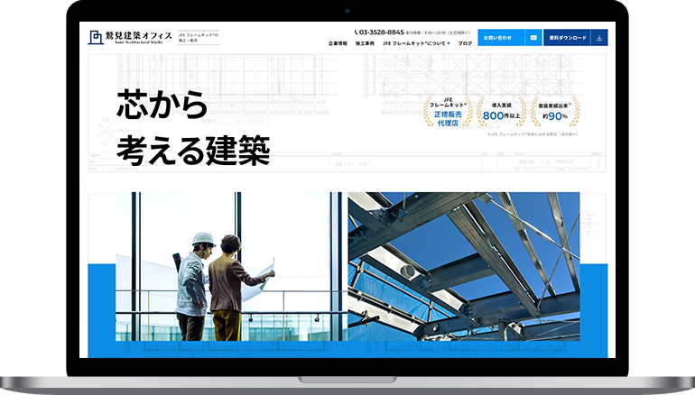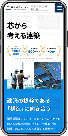 「建築の根幹である”構造”に向き合う会社」をコンセプトとし、広い視点と深い理解をもって、建築に取り組み価値創造する姿勢を示すサイトを目指しました。トップ下ではJEFフレームキットの製品特性を示しつつ、発注者にとっての具体的なメリットを掲載。さらに、さまざまな課題に対応した施工事例を紹介することで、“複雑な条件にも応えられる会社”としての専門性を訴求しました。