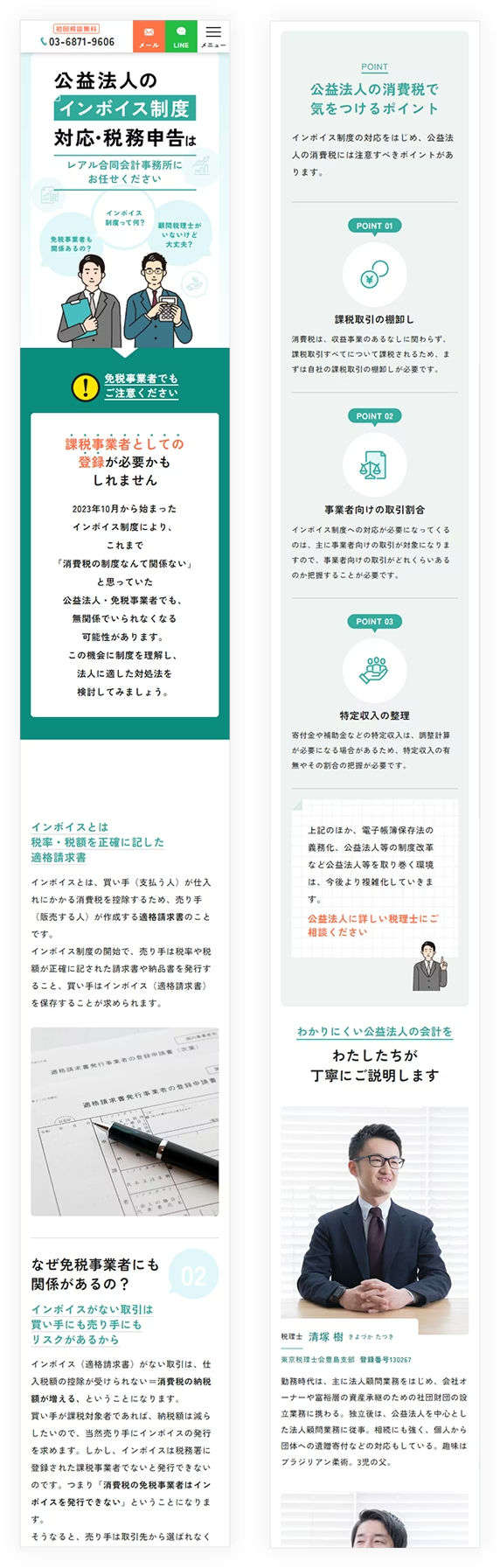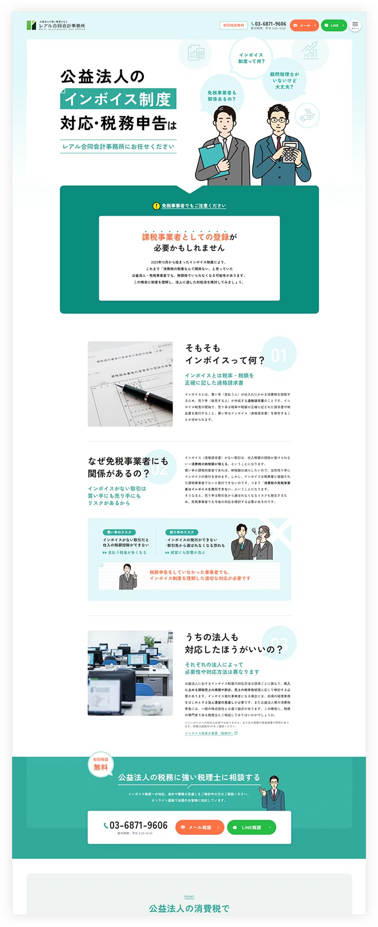 公益法人の税務に力をいれている、レアル合同会計事務所様の公益法人向け集客LPを制作しました。インボイス制度対応など、税務・会計に不安を感じている公益法人に向けて、わかりやすく対応のポイントを伝え相談しやすい印象を与えるサイトを目指しました。