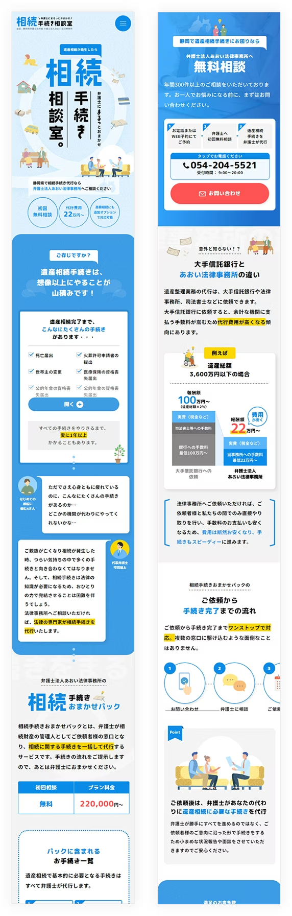 遺産相続問題に力を入れている、弁護士法人あおい法律事務所様のサイトを制作しました。遺産相続の手続き方法がわからず悩んでいる方に向け、手続きの流れや代行の仕組み等を知ってもらい、信頼し気軽に相談できる安心感を与えるサイトを目指しました。