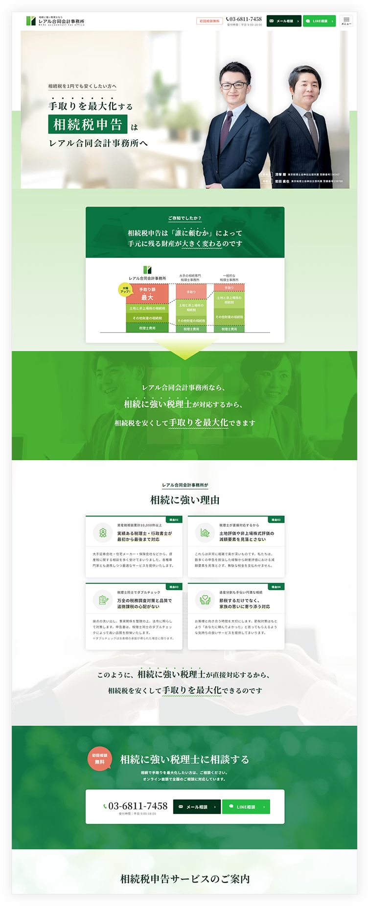 相続税申告・手続きに力を入れている、レアル合同会計事務所様の相続LPを担当しました。相続に強い税理士に依頼することでユーザーの相続財産を最大化することを伝えるサイトです。強みや専門性を明確に伝えることで、訪問者に安心感を与える内容となっております。