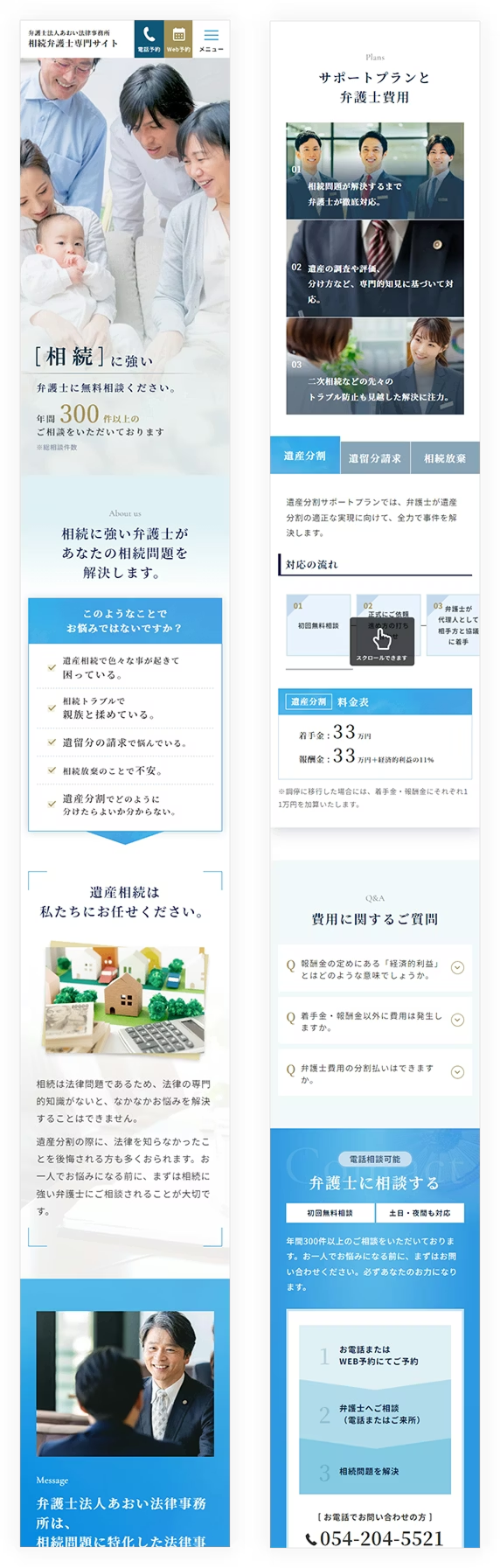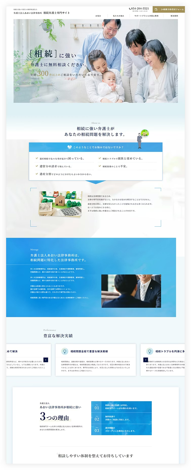 相続問題に特化した、弁護士法人あおい法律事務所のサイトを担当いたしました。故人の死や親族との争いというゆとりのない状況でも安心して頼れるように、誠実さを感じ、信頼していただけるようなサイト制作を行いました。