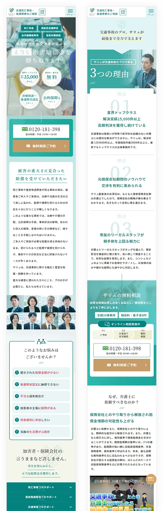 弁護士法人サリュ様の、交通事故専門サイトをリニューアルさせていただきました。以前までのサイトはブランディング向けのサイトとなっておりましたが、今回のリニューアルでサリュ様のサービス内容や強みをしっかりと訴求し、集客できるサイトとして生まれ変わりました。ユーザーのお気持ちに寄り添いながらサリュ様の想いを伝えることを意識してプロジェクトを進めました。