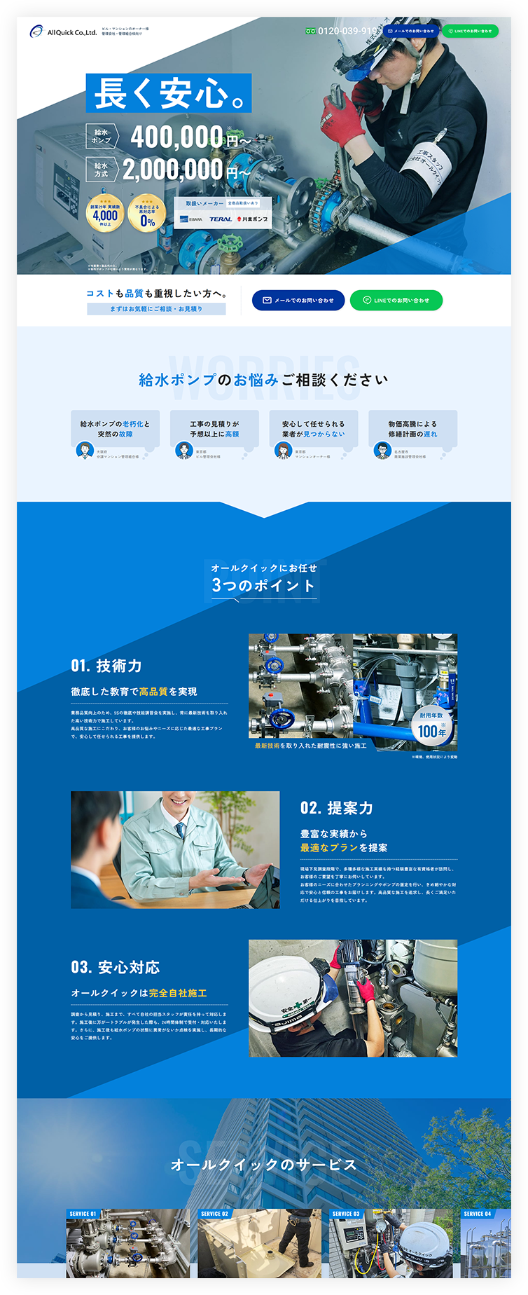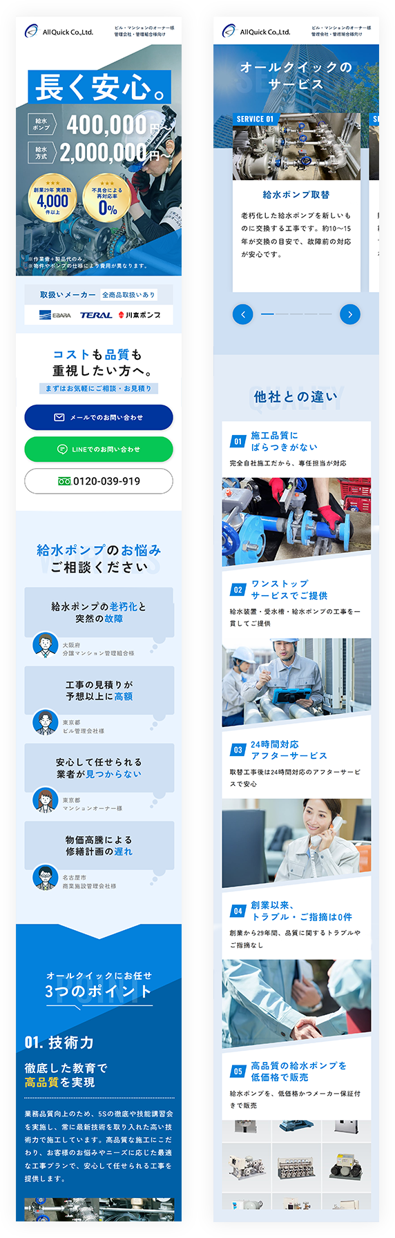 大阪市を拠点に全国規模で給水ポンプの工事と通信販売を専門としている、株式会社オールクイック様の給水ポンプLPをリニューアルしました。企業の強みや魅力を効果的に伝え、給水ポンプ工事に特化した専門性の高い企業であるという印象を与えるサイトを目指しました。