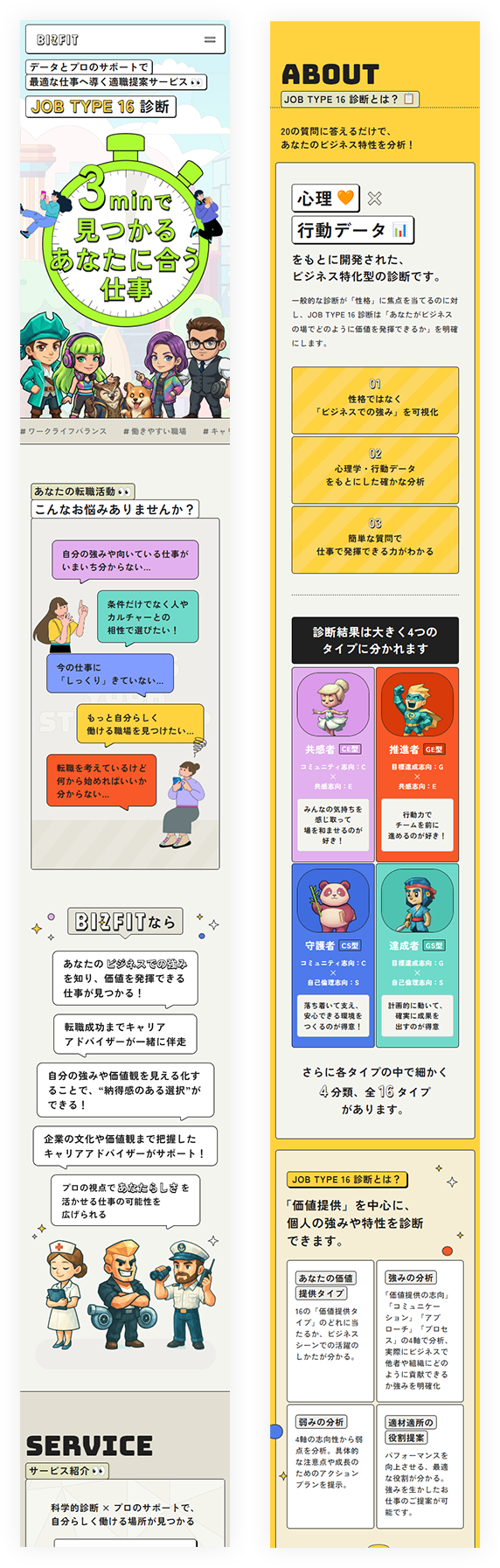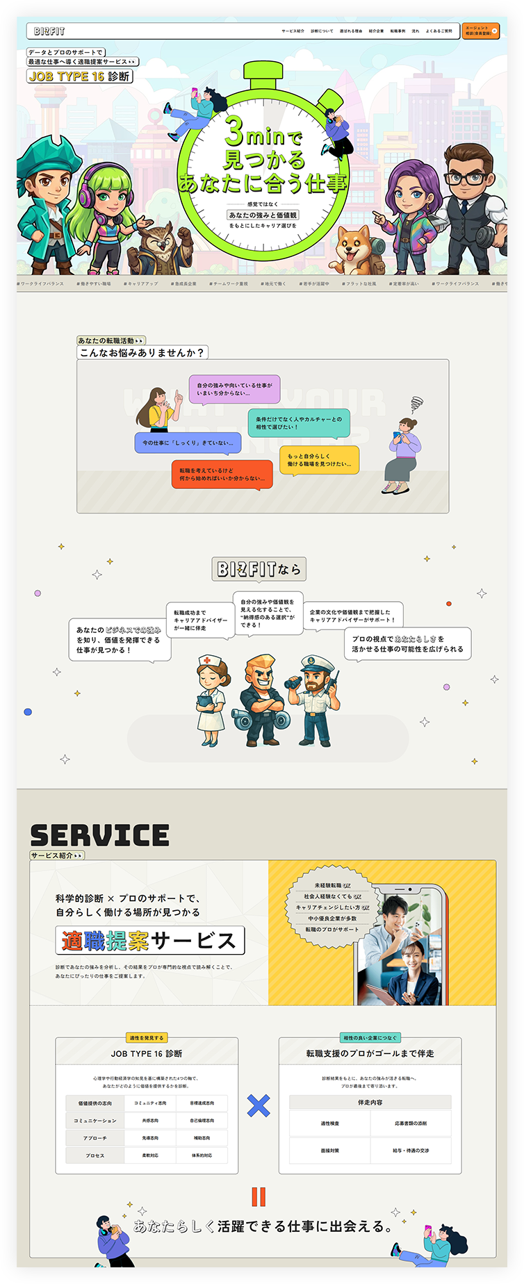 サイト全体を、SNS映えするような明るくポップなカラーリングとデザインで統一しました。単なる診断サイトではなく、キャラクターの世界観に没入できる「アトラクション」のような体験を提供することで、求職活動への心理的ハードルを下げ、ポジティブな気持ちで一歩を踏み出せるよう促しています。また、人物の笑顔の写真を取り入れることで、イラストだけでは表現しきれない「人とのつながり」や、サービスへの安心感・信頼感を伝えることを意識しました。