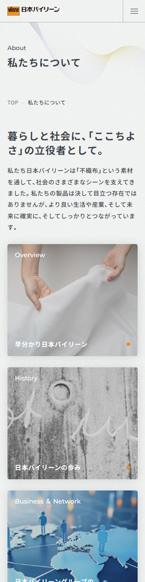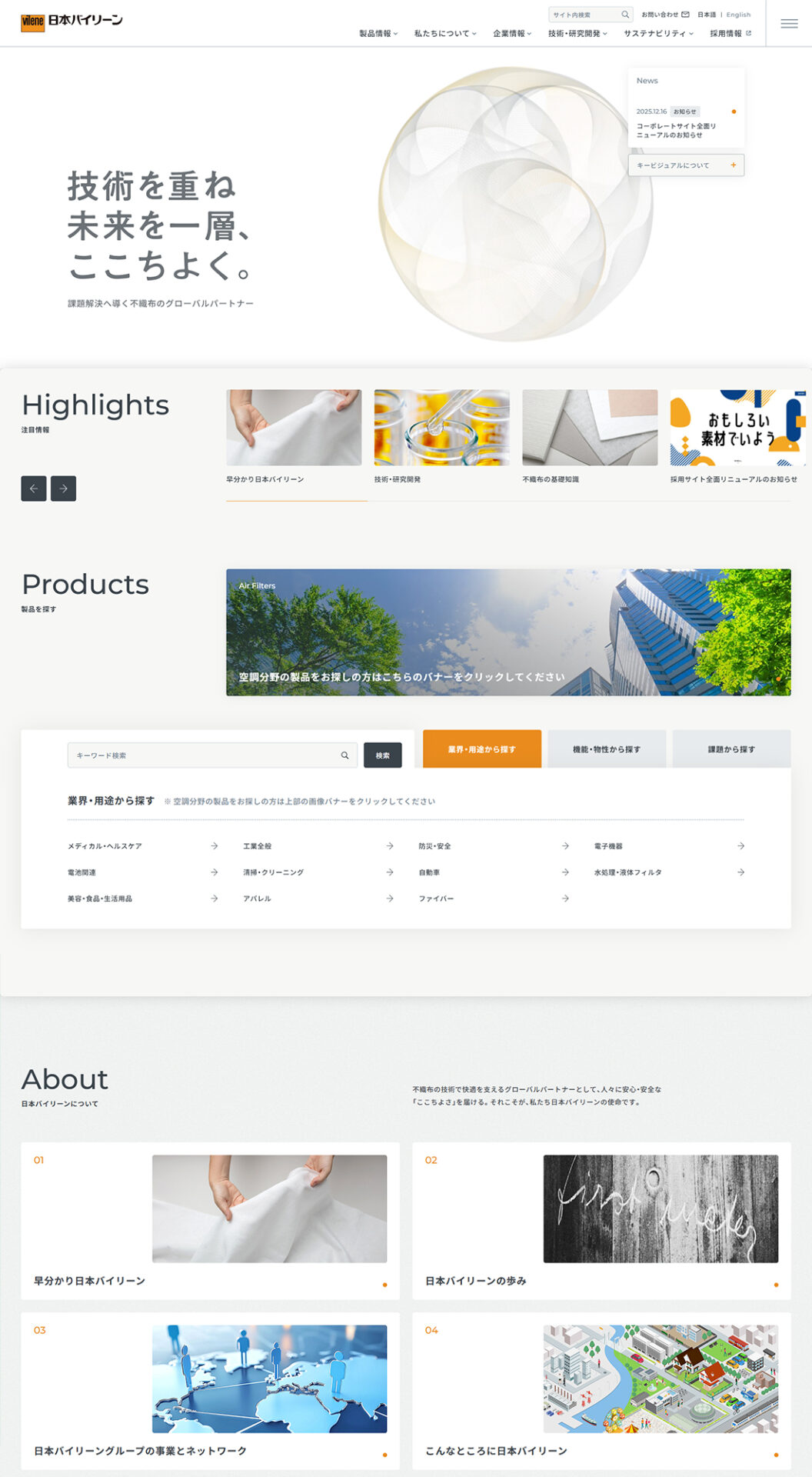 不織布を基盤とした多岐にわたる製品・技術を提供している、日本バイリーン株式会社様のコーポレートサイトをリニューアルしました。空調、医療、自動車、工業、衣料など多岐にわたる業界の方に向けて、企業や製品情報を正しく伝え、信頼感を与えるサイトを目指しました。