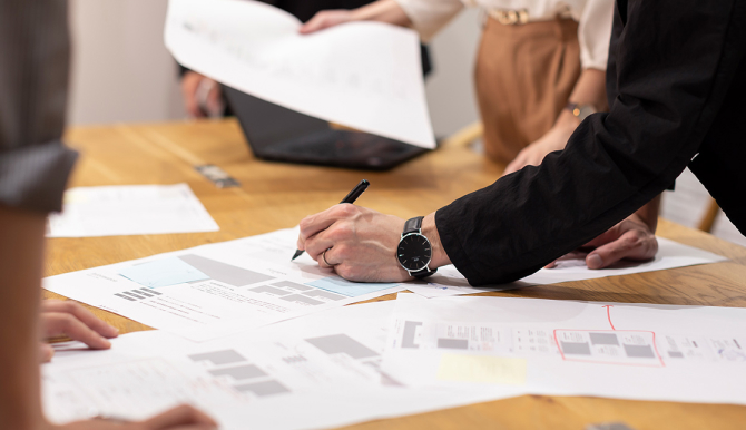 ターゲットや方向性、ゴールを明確にしたうえで、5名以上のディレクター・マーケターが協力してワイヤーフレーム(デザインの設計図)のブラッシュアップを行います。