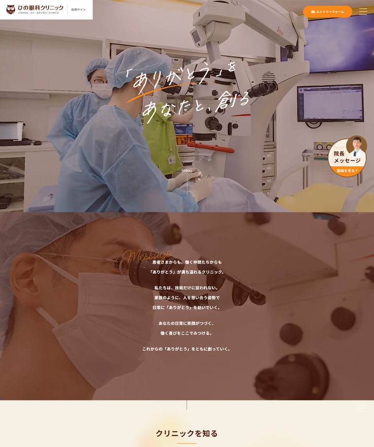 滋賀県にある、ひの眼科クリニック様の採用特設サイトを制作いたしました。公式サイトに求職者向けの情報がなく、Webでの採用活動を強化したいとご相談をいただき、制作プロジェクトがスタートしました。クリニックが大切にする考えや魅力をまっすぐに届け、想いに深く共感する方からのエントリーへと繋げるサイトを目指しました。