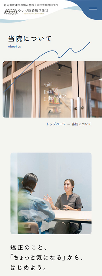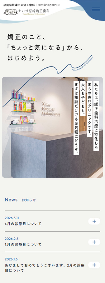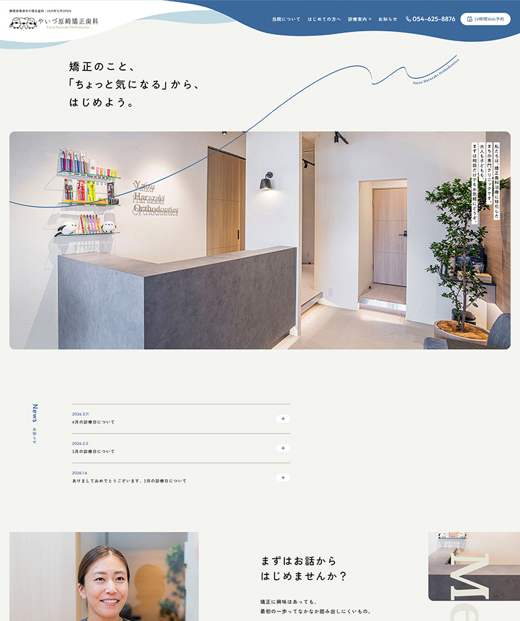 静岡県焼津市にある、やいづ原崎矯正歯科様の公式サイトを制作いたしました。地域の方々に医院の存在を広く知っていただくとともに、「地域に根ざした、信頼できる歯科医院」としての第一印象をしっかりと形成し、実際の来院へとつなげることを目指しました。
