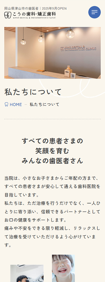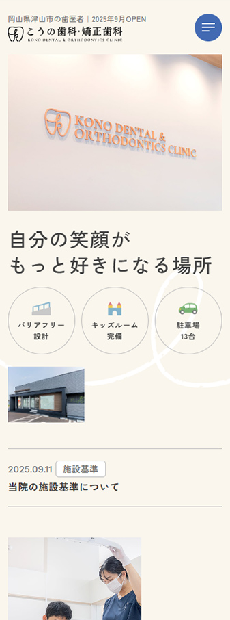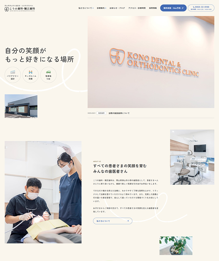 岡山県津山市で開院される、こうの歯科・矯正歯科様のコーポレートサイトを制作いたしました。集客や採用を目的とし、「笑顔づくりを支える、みんなの歯医者さん」を目指す医院の姿勢がまっすぐに伝わるサイトを目指しました。