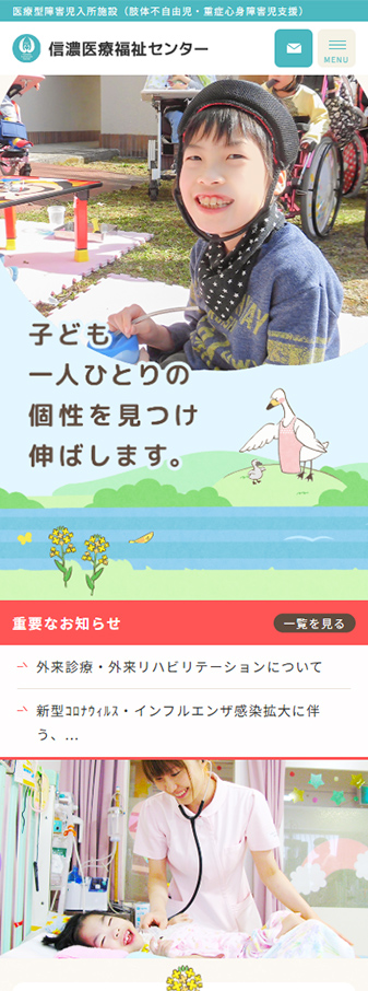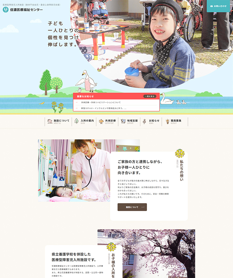 長野県の信濃医療福祉センター様のホームページを制作いたしました。「可愛いデザインでお問い合わせにつなげたい」「入所者を増やしたい」というご要望のもと、悩みを抱え、相談に大きなハードルを感じているターゲットの方々の心をそっと後押しし、安心してお問い合わせいただけるサイトを目指しました。