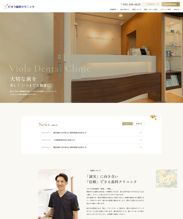 神奈川県横浜市のビオラ歯科クリニック様の医院サイトをリニューアルいたしました。しっかりと特長を伝えつつ、デザインと情報を一新したいというご要望のもと、最新技術を取り扱う「先進性」と地域に根差した「親しみやすさ」、誠実と信頼を理念に掲げる医院の「姿勢」を訴求するサイトを目指しました。