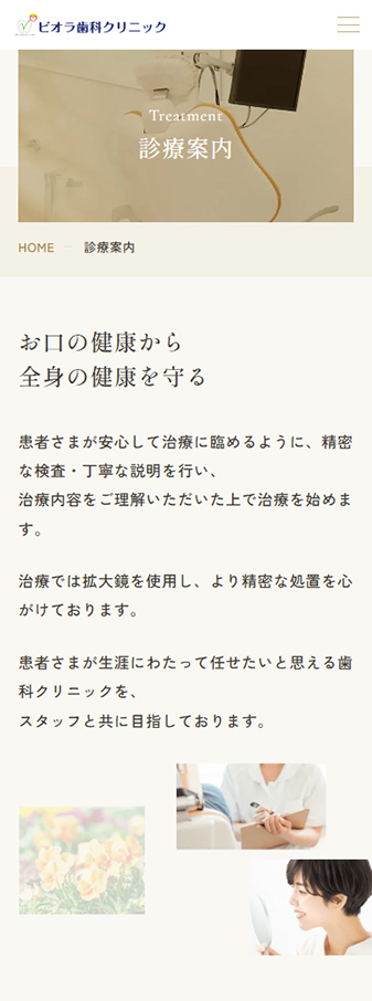 予防歯科と部分矯正に力を入れている特長をわかりやすく伝えるよう設計いたしました。また、医院の名前の由来でもあるビオラの花言葉「信頼」「誠実」を理念としていることを掲載し、初めて来院される方にも親近感を抱いてもらえるようにしています。