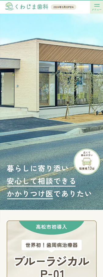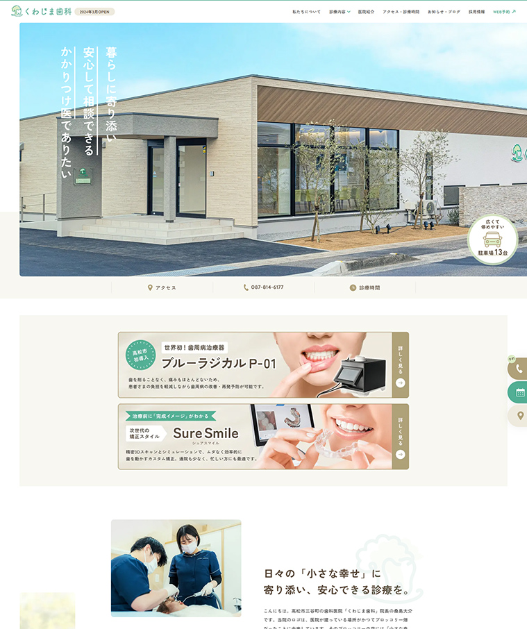 香川県高松市の、くわじま歯科様の医院サイトを制作いたしました。認知度の向上や、集客・採用の強化を目的に「地域の人に愛される、相談しやすい歯医者」をコンセプトとして初めての方でも安心できる、やさしくやわらかい印象を与える医院サイトを目指しました。