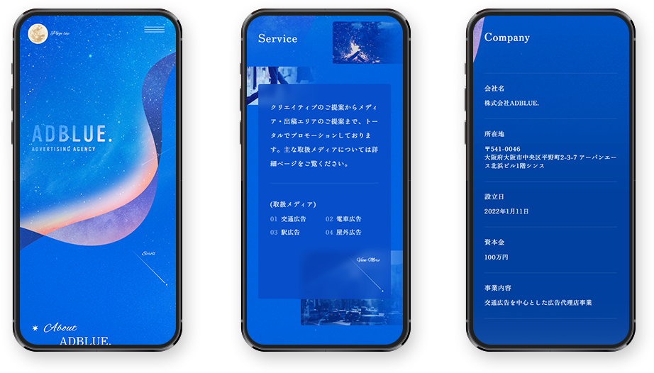 大阪で交通広告の代理店事業を行っている、株式会社ADBLUE.様のコーポレートサイトを制作しました。星と広告サービスを結び付けるビジュアル表現を意識し、企業の名刺代わりとなるサイトを目指しました。