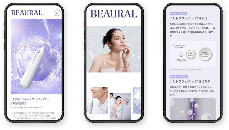 株式会社I-ne様の新ブランドである、ウルトラファインバブル搭載口腔洗浄機「BEAURAL」のブランドサイトを制作しました。オーラルケアに力を入れている層に対し、製品技術説明を丁寧に行い、ブランドの信頼性を高めることを目指しました。