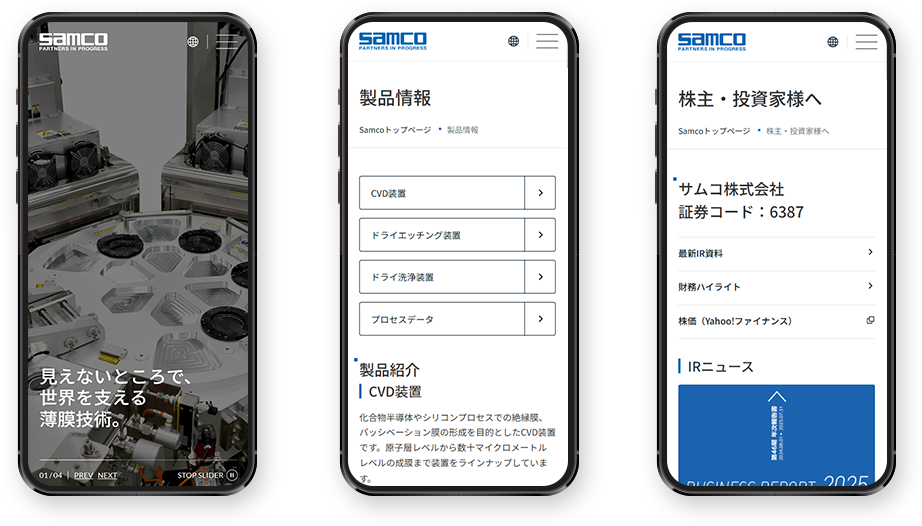 薄膜形成・微細加工・表面処理技術に特化した半導体プロセス装置メーカーである、サムコ株式会社様のコーポレートサイトをリニューアルしました。グローバルで一貫性のある、現代的なブランドイメージを確立させるとともに、主要なステークホルダーに向けて製品ポートフォリオや技術的専門性を効果的に訴求することを目指しました。