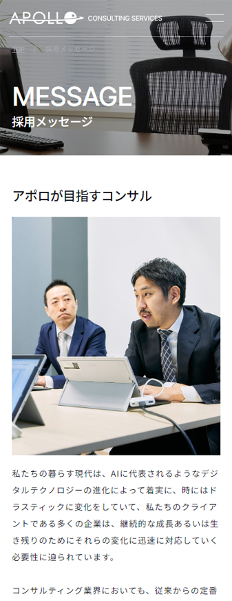 戦略立案から実行に至る一気通貫のサービスを提供するコンサルティング企業、アポロ株式会社様の採用サイトを制作させていただきました。コンサルティングサービスの打ち出し方や採用状況においての課題を認識していることから、当社へご相談いただきました。コンサルタント採用の強化を図るため、コーポレートサイトおよび部門紹介サイトの制作も行い、トータルブランディングを図りました。