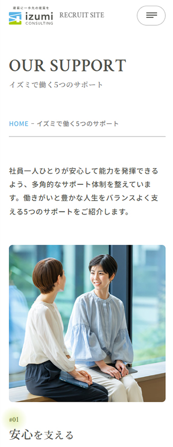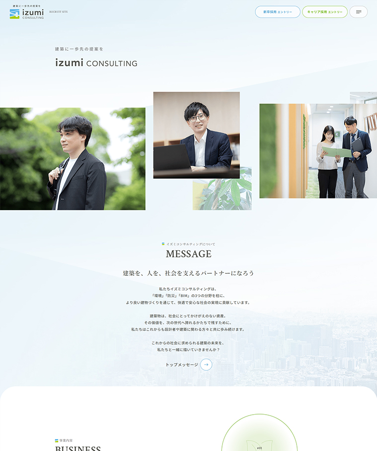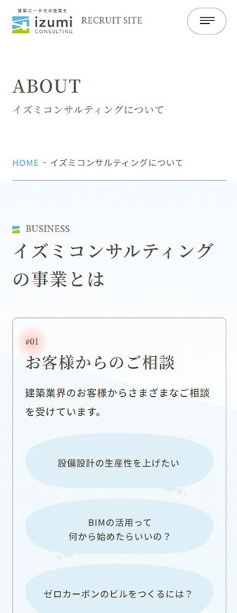 「建築の未来は、あなたの力が必要だ。」をサイトのコンセプトし、これからの社会に求められる建築の未来を、共に築いていきたいという想いを伝えるサイトを目指しました。「イズミコンサルティングについて」のページでは、事業について掲載。コンサルティング体制を図で示すとともに、強みを明確にすることで求職者に分かりやすく伝えることを意識しました。