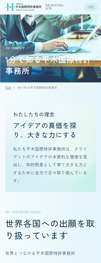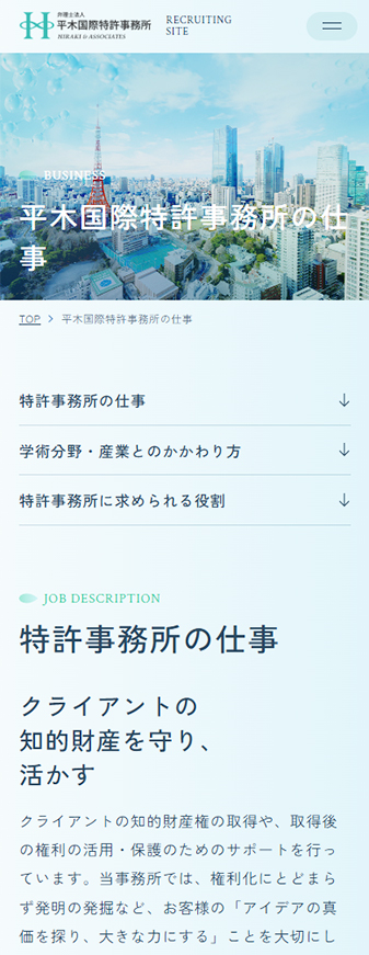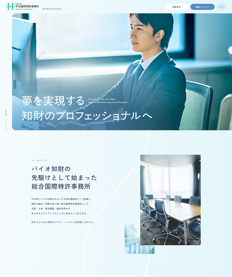 バイオ化学分野を中心に扱う総合特許事務所、平木国際特許事務所様の採用サイトを制作しました。弊社が手がけた他事務所サイトをご覧になったことがきっかけで、コーポレートサイトのリニューアルと併せてご相談いただきました。研究者や新卒学生などの求職者に向けて、専門性を活かしていきいきと働く姿を描けるような、前向きで信頼感のあるサイトを目指しました。
