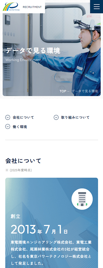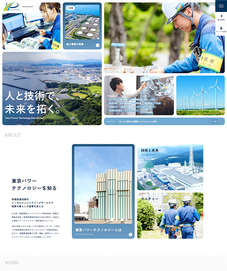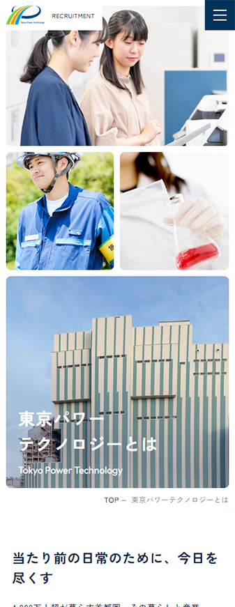 発電所の建設・保守・運転、環境調査・分析などを行っている、東京パワーテクノロジー株式会社様の採用サイトをリニューアルしました。採用強化のリニューアルで、今回ご依頼いただきました。社会インフラを支えるという責任感と使命感が伝わるよう企業・事業・職種情報を打ち出す構成で、求職者の入社意欲を高め、応募につながるサイトを目指しました。