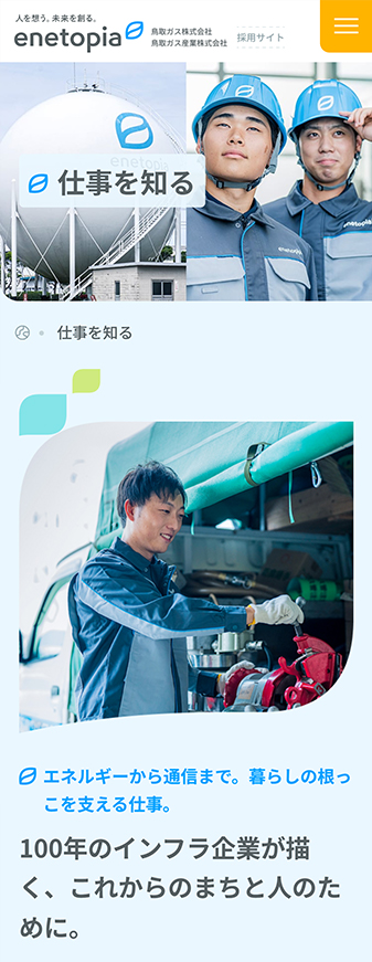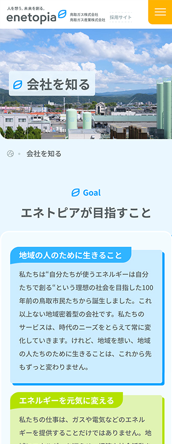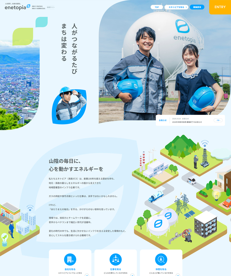山陰エリア(鳥取・島根)でガスをはじめとするエネルギー事業を展開する、鳥取ガス株式会社様の採用サイトを制作しました。100年にわたり地域とともに歩んできた安定感と、次の時代に向けて挑戦を続ける姿勢を両立させています。「地域に根ざす誇り」と「新しいエネルギーを生み出す情熱」の両面から、企業の魅力を伝えることを目指しました。