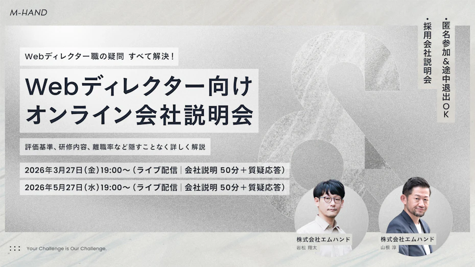エムハンドでは、通年でWebディレクターを積極的に採用しており、入社後の研修プログラムから評価基準に至るまで「仕組み」の継続的な強化を行っています。しかし、求職者の皆様にとって、外側からは見えにくい「現場のリアル」への不安があることも事実です。「リアルな姿が見えにくい」「応募に踏み切るハードルが高い」そんな疑問に先回りして答えるため、私たちは「エムハンドメディア」を通じて、Q&Aや社内の知見をオープンに公開しております。ディレクター領域の仕組み全体をわかりやすくご紹介いたします。加えて、通常なかなか聞くことのできない評価基準、入社後の給与推移、研修内容、離職率、残業時間、上長との関係性、Webディレクター業務の“しんどさ”や入社後のよくあるギャップに至るまで、包み隠さずお話しします。ここなら安心して一歩を踏み出していただくための、透明性の高いイベントです。質疑応答の時間もたっぷり設けておりますので、ぜひお気軽にご参加ください。