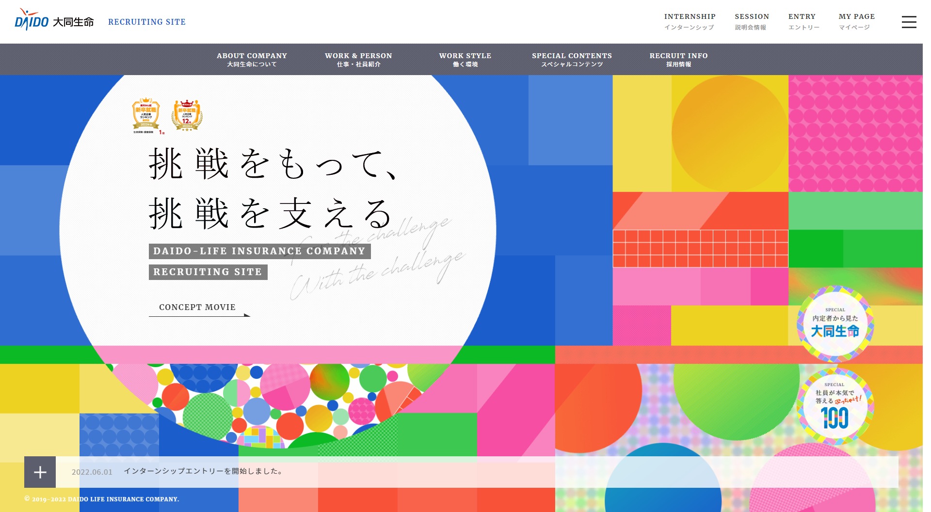 保険という企業の土台となるサービスを四角形のブロックで表現し、コンバージョンエリアでは様々な色のブロックが組み合わさって土台が完成するアニメーションを作りました。また、ファーストビューや下層の背景に使われている円形のデザインは「人」を表現。しっかりとした土台の上で、様々な人材が力を発揮するイメージをカラフルな図形で表したファーストビューはインパクトのある挑戦的なものになり、「挑戦」というキーワードそのものをデザインに落とし込むことができました。
