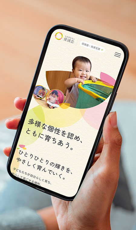 静岡県を中心に福祉関連施設や保育園などを展開している、社会福祉法人愛誠会様の児童事業本部サイトを制作しました。保育施設を検討している保護者の方などに向けて、理念である「奉仕のこころ」を丁寧に伝え、安心して子どもを預けられる信頼感の醸成を目指しました。